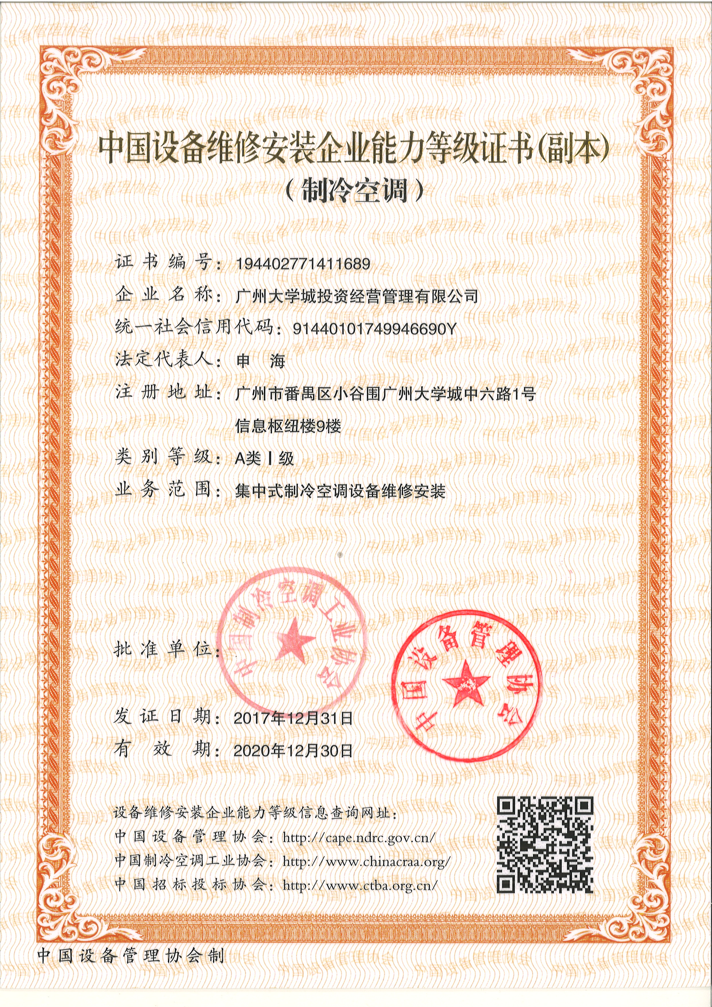 投资公司制冷空调行业一级维修资...