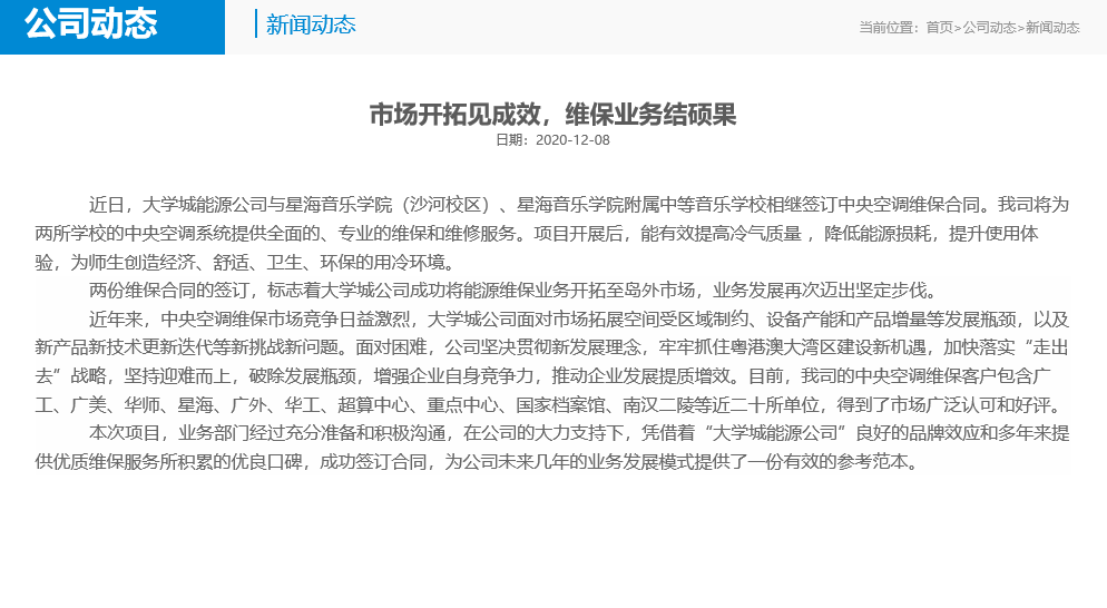 近日,大学城能源公司与星海音乐学院(沙河校区)、星海音乐学院附属中等音乐学校相继签订中央空调维保合同。我司将为两所学校的中央空调系统提供全面的、专业的维保和维修服务。
