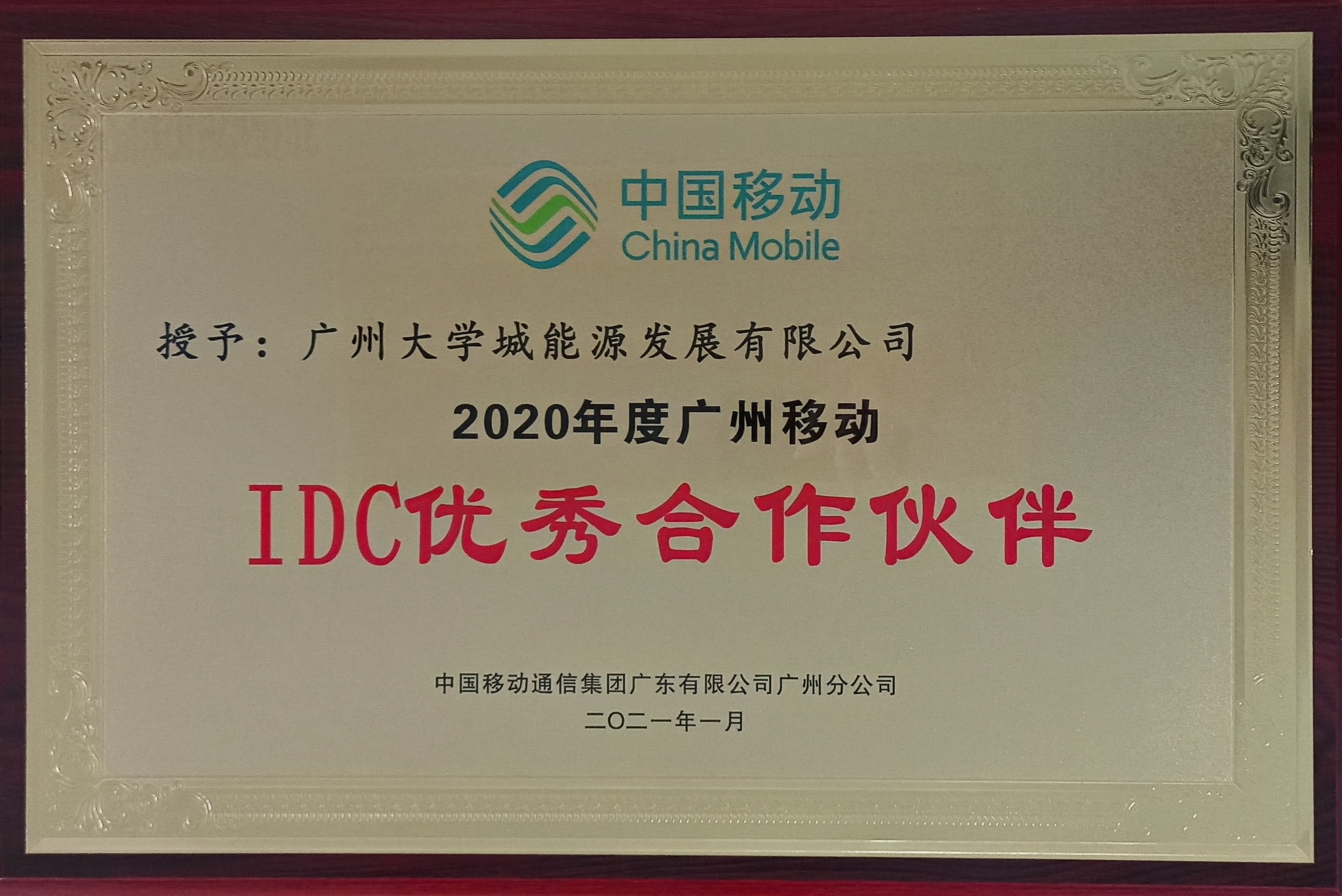 广州大学城能源发展有限公司喜获广州移动“2020年度广州移动IDC优秀合作伙伴”荣誉称号。