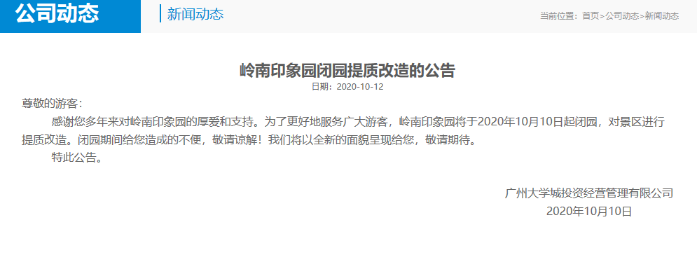 岭南印象园闭园提质改造的公告