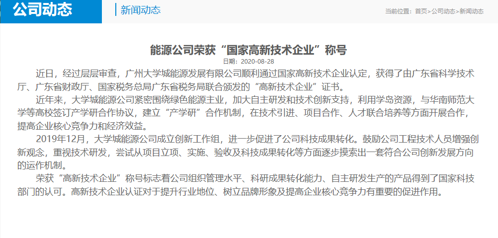 广州大学城能源发展有限公司顺利通过国家高新技术企业认定,获得了由广东省科学技术厅、广东省财政厅、国家税务总局广东省税务局联合颁发的“高新技术企业”证书。