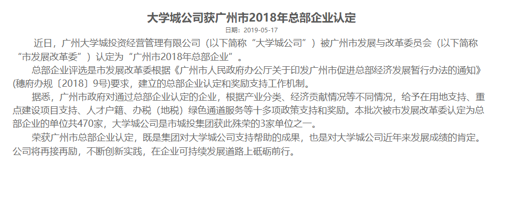 近日,广州大学城投资经营管理有限公司(以下简称“大学城公司”)被广州市发展与改革委员会(以下简称“广州市发改委”)认定为“广州市2018年总部企业”。
